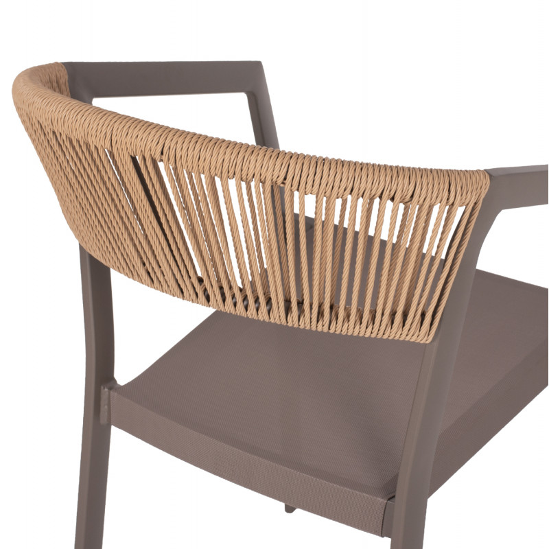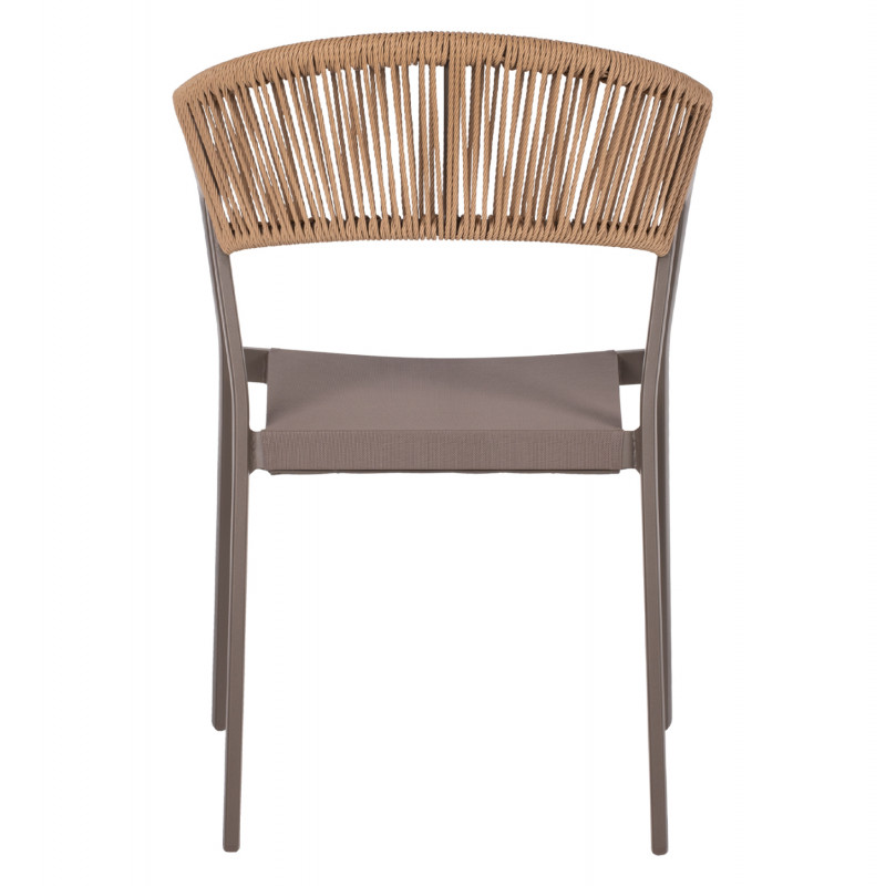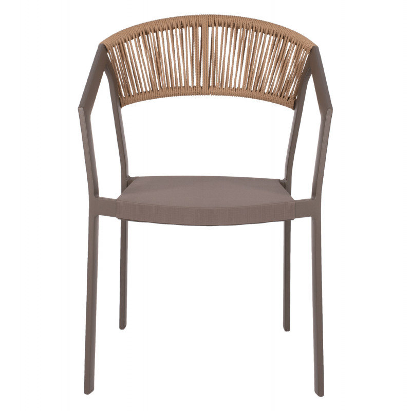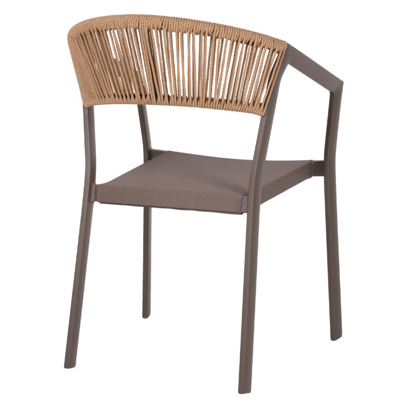 Η πλάτη της πολυθρόνας είναι επενδυμένη με πολυεστερικό RATTAN. Στα περισσότερα έπιπλα κήπου και γενικά σε έπιπλα για εξωτερικούς χώρους χρησιμοποιείται συνθετικό υλικό από PVC, δηλαδή τεχνητές ίνες υψηλής ποιότητας. Αυτό δίνει στην κατασκευή εξαιρετική αντοχή και ανθεκτικότητα σε ακραίες συνθήκες ζέστης ή κρύου.