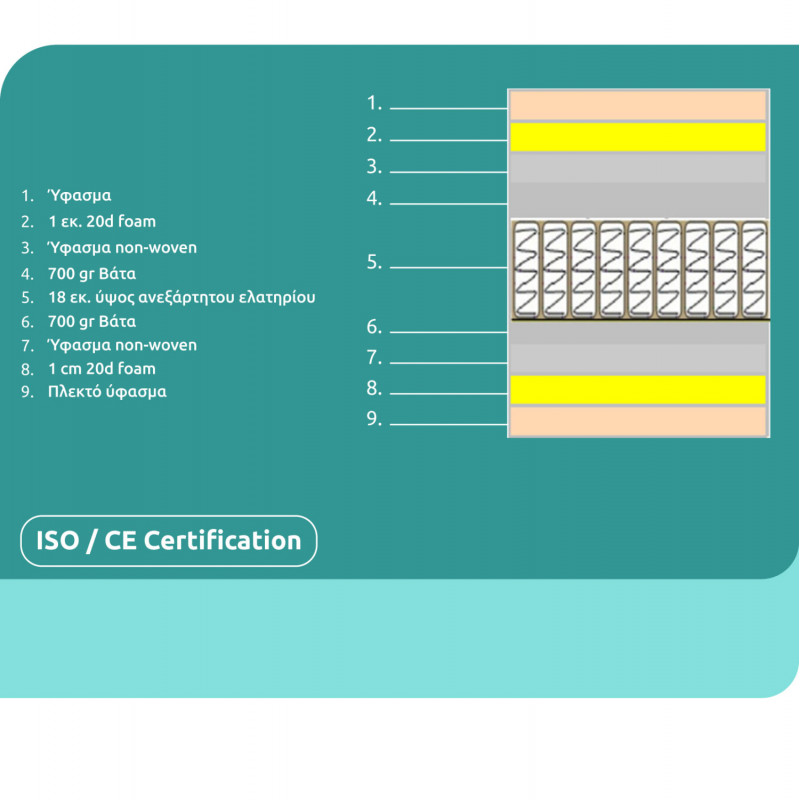 Η καρδιά του στρώματος αποτελείται από ανεξάρτητα ελατήρια ύψους 18 εκ, με πάχος 1,8 χλστ.