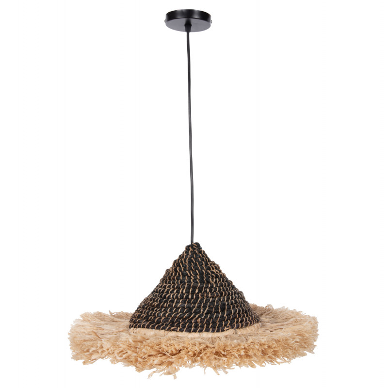 Hm7789- Kρεμαστό φωτιστικό---- Αν επιθυμείτε να διακοσμήσετε το χώρο σας με ένα φωτιστικό σε boho στυλ με εξωτικά υλικά, αυτό είναι μια χαρακτηριστική επιλογή. Είναι ένα μονόφωτο με «καπέλο» φτιαγμένο από φουντωτές ίνες σιζάλ σε φυσικό χρώμα και ανακυκλωμένες ίνες κάνναβης Μανίλας σε μαύρο χρώμα.