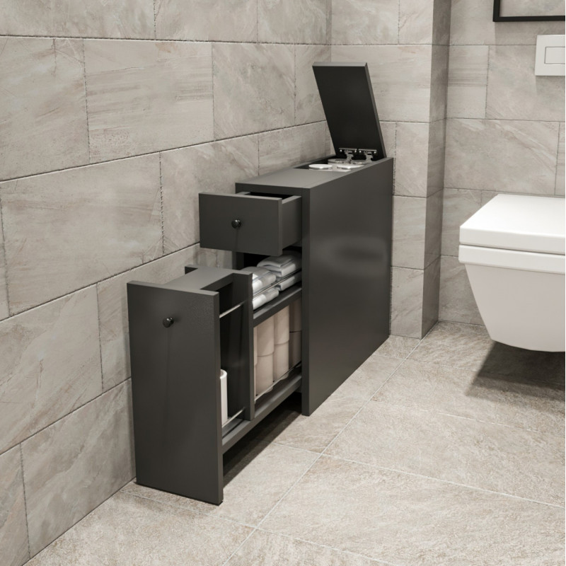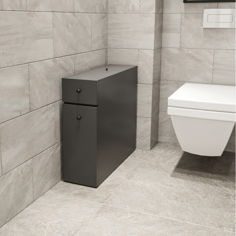 ΗΜ9424.01- Ντουλάπι πολλαπλών χρήσεων----Σας παρουσιάζουμε το καινούριο έπιπλο για τον χώρο του μπάνιου σε όμορφο ανθρακί χρώμα. Είναι ένα μονοκόμματο έπιπλο στενό και κοντό, με ένα συρτάρι ψηλό και βαθύ στο κάτω μέρος και ένα συρτάρι μικρό από πάνω. Επίσης, διαθέτει κι έναν αποθηκευτικό χώρο πίσω από το μικρό συρτάρι που ανοίγει από πάνω με πορτάκι. Πρόκειται για ένα πρακτικό έπιπλο που θα σας λύσει τα χέρια τόσο με τους αποθηκευτικούς χώρους που διαθέτει, όσο και με τις βολικές του διαστάσεις.