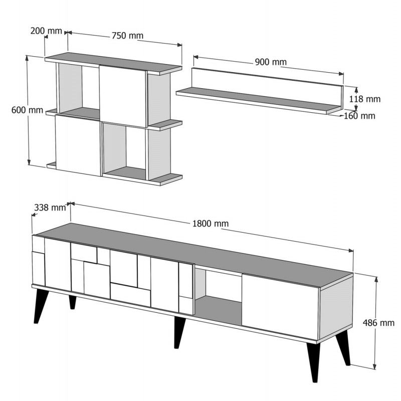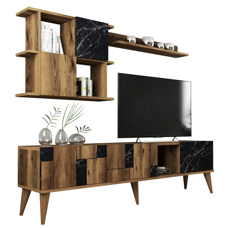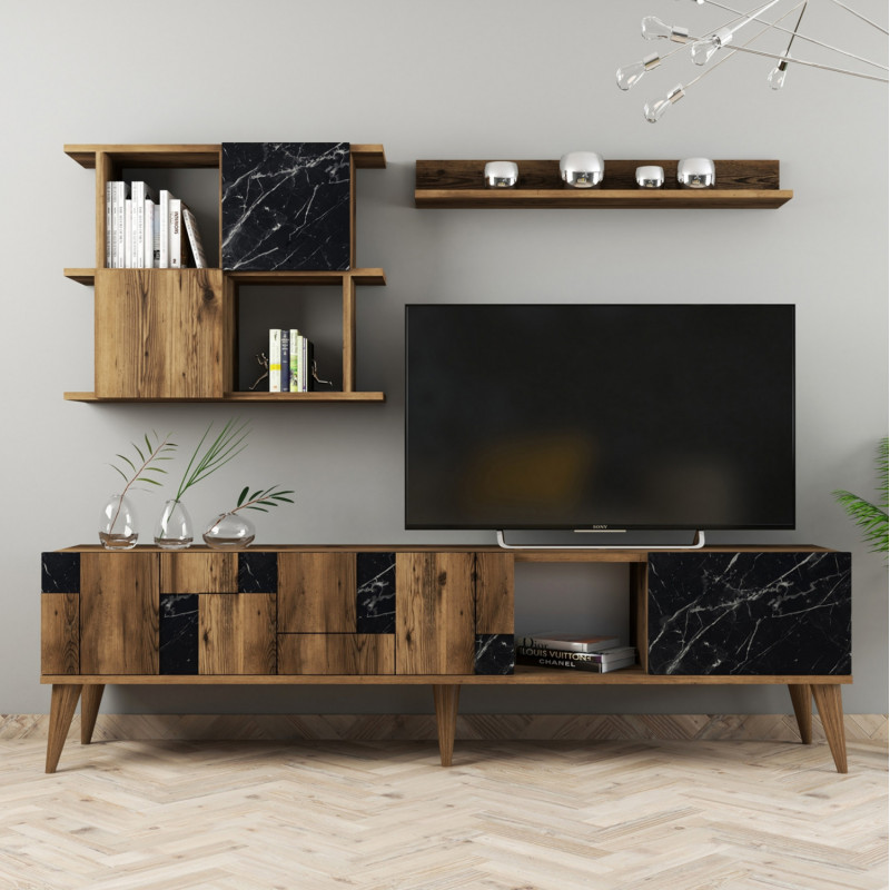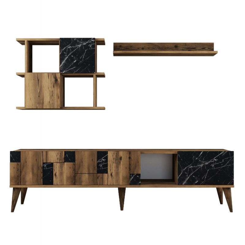 Το TRONDE είναι ένα μοντέρνο και λειτουργικό έπιπλο τηλεόρασης, που θα ομορφύνει το σαλόνι σας! Είναι μακρύ και διαθέτει 1 ντουλάπι με ενιαίο χώρο στην αριστερή πλευρά της κύριας μονάδας δαπέδου που ανοίγει προς τα κάτω, έναν ανοιχτό χώρο αποθήκευσης στην μέση καθώς και ένα ακόμα ντουλάπι στην δεξιά πλευρά. Η σύνθεση ολοκληρώνεται με επιτοίχια ράφια και ντουλάπια που δίνουν άπλετο χώρο είτε για την διακόσμηση σας, είτε για αποθήκευση αντικειμένων. Διαθέτει 4 πόδια στην μονάδα δαπέδου και ένα επιπλέον στο κέντρο για μεγαλύτερη στιβαρότητα, ενώ το έπιπλο έρχεται σε μια πανέμορφη διχρωμία καρυδί με μαύρο μάρμαρο look, και οι διαστάσεις του είναι κατάλληλες για όλες τις τηλεοράσεις εάν θέλετε η τηλεόρασή σας να στηρίζεται σε βάση. Πρόκειται για μια κομψή και ολοκληρωμένη πρόταση για το σαλόνι σας!
