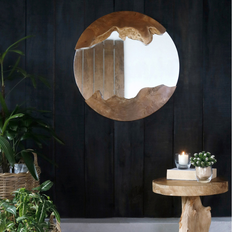 O καθρέπτης ΗΜ9360 είναι πραγματικά ένα εντυπωσιακό κομμάτι στην διακόσμηση του σπιτιού σας! Το design του είναι μοναδικό με τον κυκλικό καθρέφτη να πλαισιώνεται πάνω και κάτω με κομμάτια μασίφ ξύλου TEAK. Αισθητικά δίνει μια απόκοσμη εντύπωση μαγνητίζοντας τα βλέμματα. Τα ξύλα είναι στο φυσικό τους χρώμα και οι διαστάσεις όλης της κατασκευής είναι ικανοποιητικές.